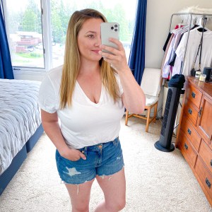 Now, I’m not going to lie. I had more fun trying on the Target shorts than I did the Walmart ones and I’ll tell you why. When I went to Walmart, I was rushed but I saw all of these great short options and I just started grabbing. I wasn’t putting a ton of forward thinking into doing a try on or a post but here we are. When I was looking at Target, the light wash jean shorts, I had been looking at for weeks before I bought. They were sold out for a loooong time so, I had them on an email alert for when they would be back in stock. Its funny because, I ordered their darker twin as an impulse and I ended up liking the dark pair better. I tend to gravitate towards darker wash jeans anyways so that’s really no surprise. When I was buying the others, I thought some fun variety with the pink checkered and blue stripes would be fun for you guys. And you ended up LOVING the blue striped pair!